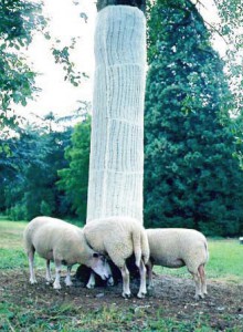 C'est vrai qu'il y a quelque chose dans cette pièce qui évoque l'idée d'un conte, l'idée et la réalisation de cette pièce est déjà une sorte de conte. C'est à partir de la laine des moutons qui vivaient dans le paysage de ta résidence à Bionnay que j'avais demandé à faire tondre pour être enfin tricoté autour d'un tronc d'arbre pour lui tenir chaud. Cette grande image suspendue dans le jardin de l'Hôtel Particulier nous raconte un peu cette histoire. Je tenais beaucoup à ce support transparent sur lequel est imprimé la photographie, ce qui permet une belle incrustation dans le paysage, nous pouvons aussi percevoir ce qui est derrière l'image.