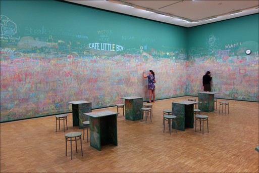 Je suis content de ma dernière exposition au Japon qui est une exposition de groupe à Kyoto : Parasophia, dans laquelle je présente une installation dont nous avons déjà parlé qui est aussi présentée au Centre Pompidou dans une sorte d'effet miroir et qui en fait donne un sens particulier dans le contexte Japonais: Café Little Boy. L'origine de cette installation est un tableau d'école qui a survécu à l'explosion de la bombe atomique d'Hiroshima et dont les survivants se servaient pour laisser des messages aux proches, famille etc. Cela fait maintenant bien plus de cent fois que je me suis rendu dans ce pays, ma première exposition personnelle date de 1983. J'ai toujours encore la même fascination de mes premières rencontres avec le Japon. Le Japon est un pays qui est parfois très rude, mais d'une manière générale j'aime les Japonais, les rituels, le coté Zen, les jardins, la nourriture. Alors peut-être que les Japonais ressentent des points communs !